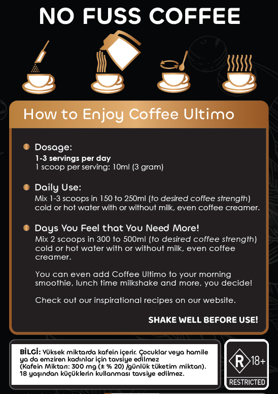 Coffee Ultimo, sadece kısa süreli popüler bir şey değil. Burada kalıcı. Özel tarifimiz, uzun bir süre boyunca size destek olmak için tasarlandı.Saf kahve